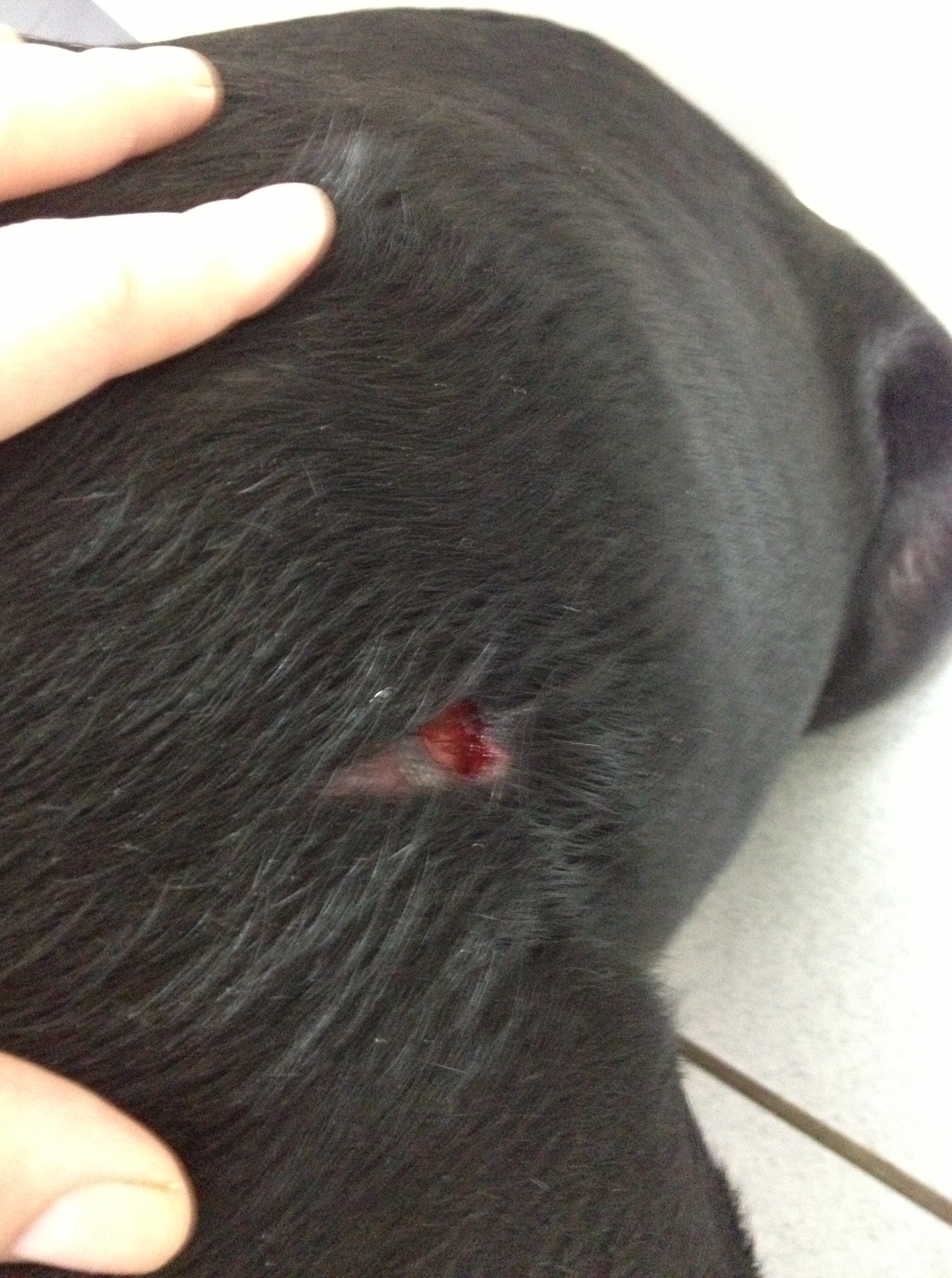Jasmine’s a fairly lean but very strong dog. Had she cracked a rib or punctured her lung? You could see right down under the skin to the membrane below. And she was pretty much in shock, shivering and looking at a loss to what had happened.
