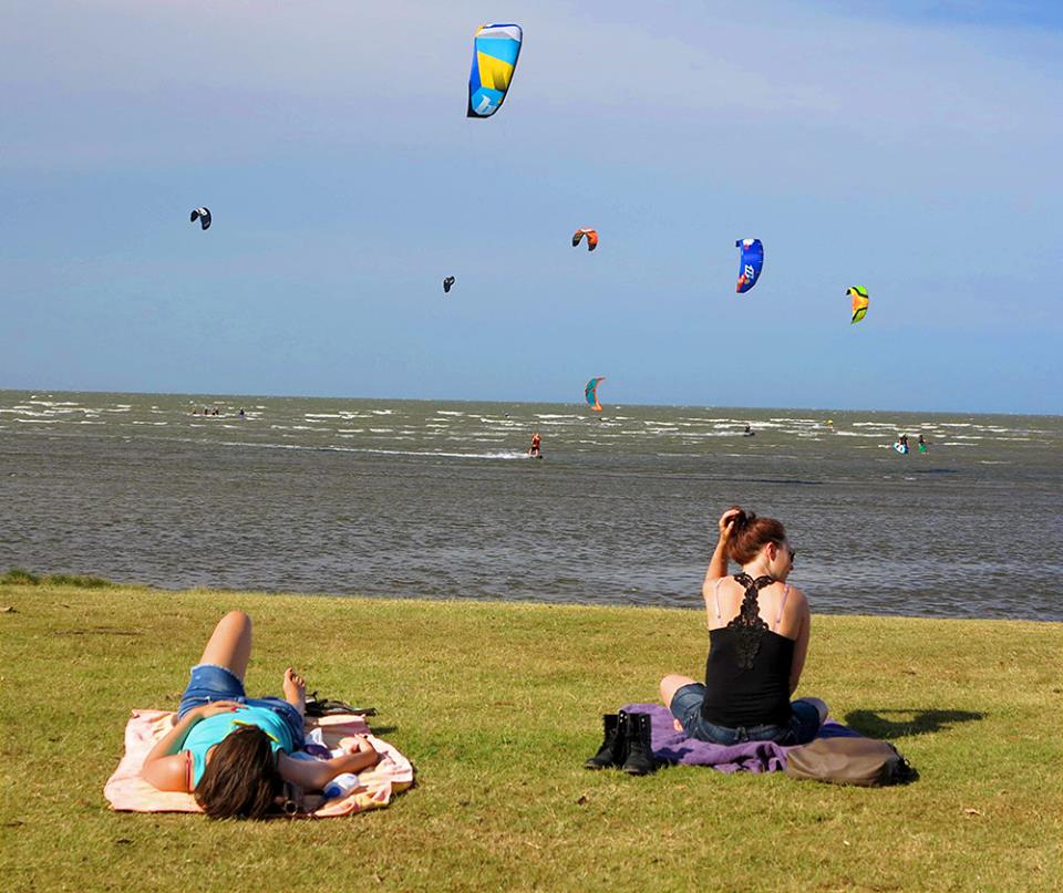 The Brighton-Sandgate foreshore is an ideal place for the sport, as deep grassy verges at both ends allow kitesurfers to observe, prepare and pack up afterwards without blocking access to pedestrians, vehicles and others visiting the area.