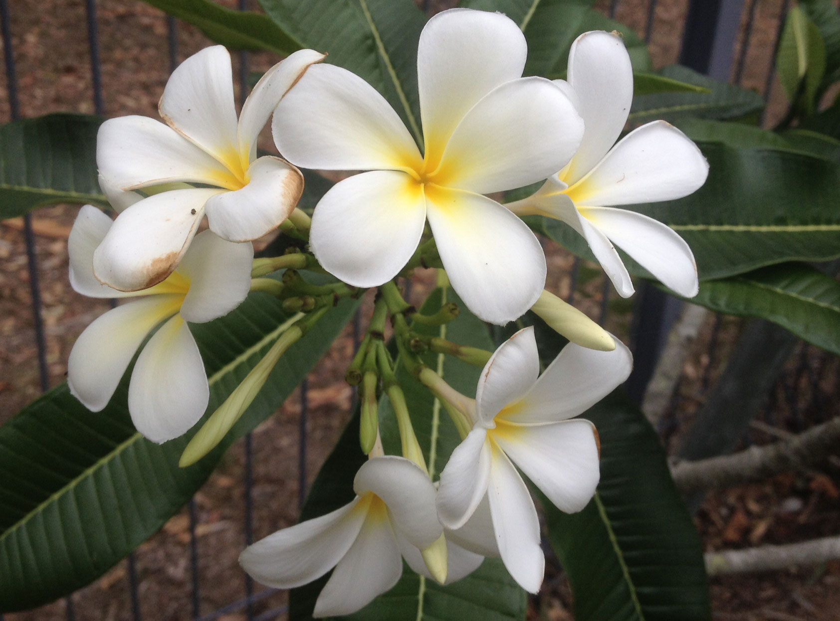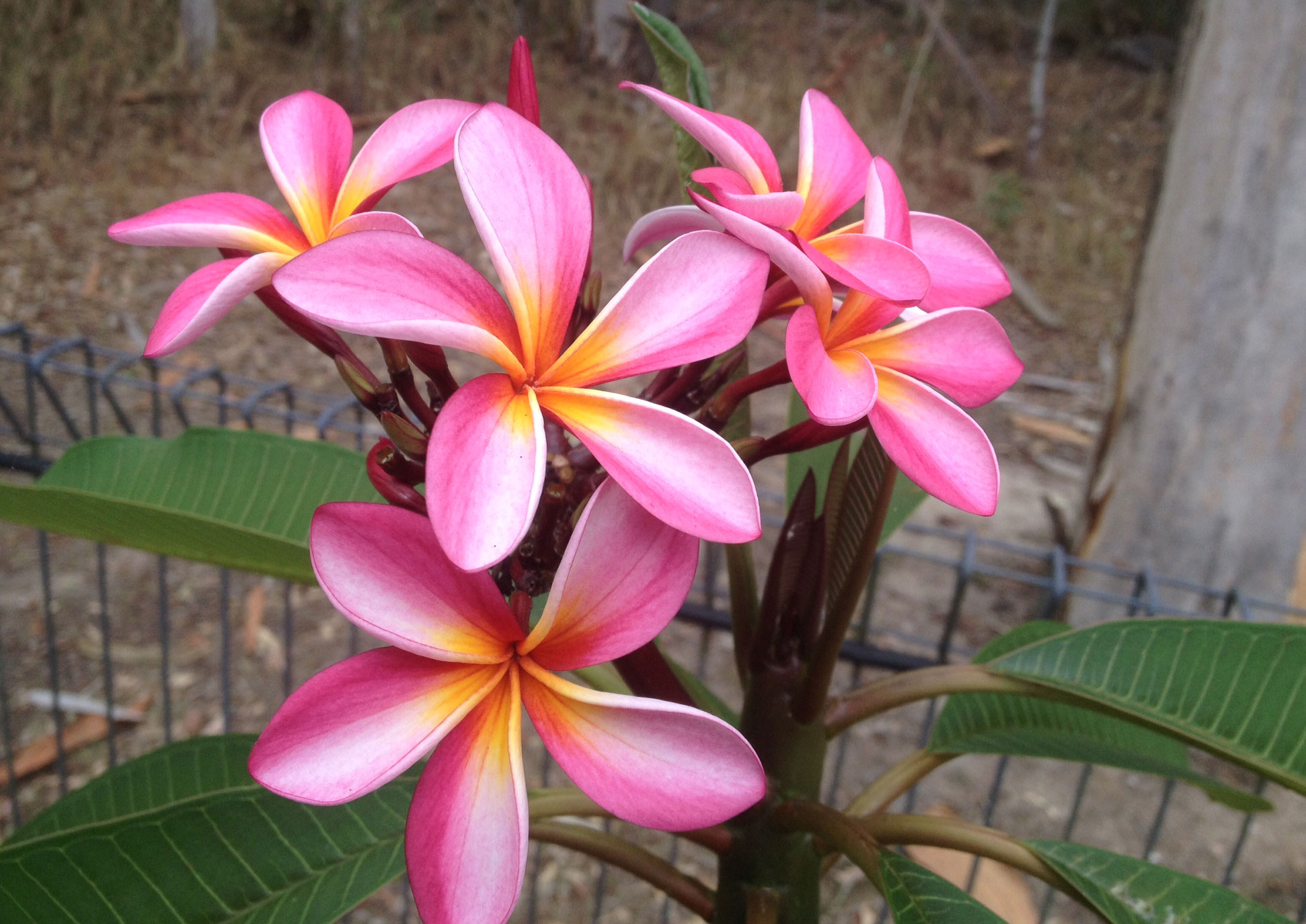 Thankfully, among our garden plants there are still a few showy individuals. Here, for your viewing pleasure, are three of them: a tri-colour frangipani (plumeria rubra pink), its white cousin (plumeria alba) and a gorgeous deeper pink version (plumeria rubra tricolor), all framed by the dry bushland behind them.