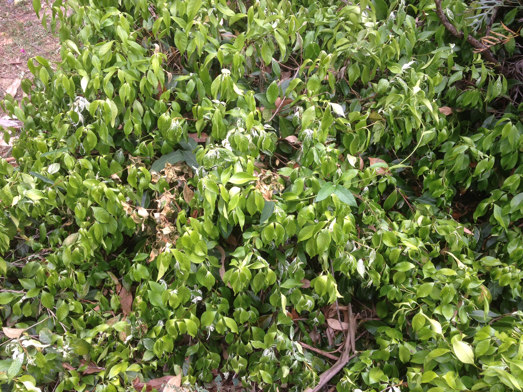 Even the tricolour jasmine is shielding itself from this year’s blast of summer heat. Picture: Trina McLellan (iPhone 4S)