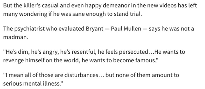 Airing such footage, some argue, showed the nature of the man, his intellect, his acknowledgment of his actions and that he admitted to acting alone, discounting the slew of conspiracy theorists, and his own mother, who have speculated otherwise. Other major news outlets linked heavily to these programs – including news.com.au on at least three occasions (on March 7, March 8 and March 14) and Fairfax websites (a Seven-provided trailer on March 4 plus a review of episode 1 on March 7) – again focusing on superficial, ‘sensational’ details. In reality, the airing of Bryant’s taped evidence – whether viewed or not, because it will certainly come up in private conversations – merely tears open painful wounds for those with a real, lifetime connection to this horrific event.
