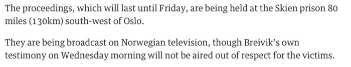 An excerpt from The Guardian’s reportage of Norway’s collective media decision not to air Breivik’s evidence to his legal appeal.